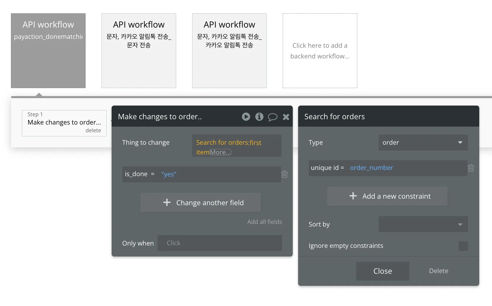 그리고 워크플로우의 액션 이벤트로 관련된 주문 데이터를 처리하는 로직을 등록하면 됩니다.