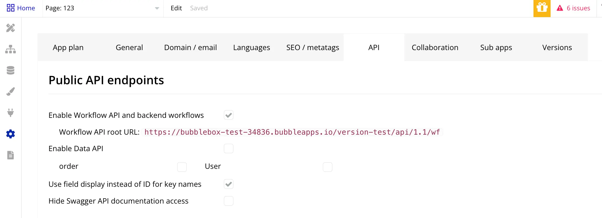 에디터에서 [Setting] > [API]로 이동하고, [Enable workflow API and backend workflows]를 활성화합니다.