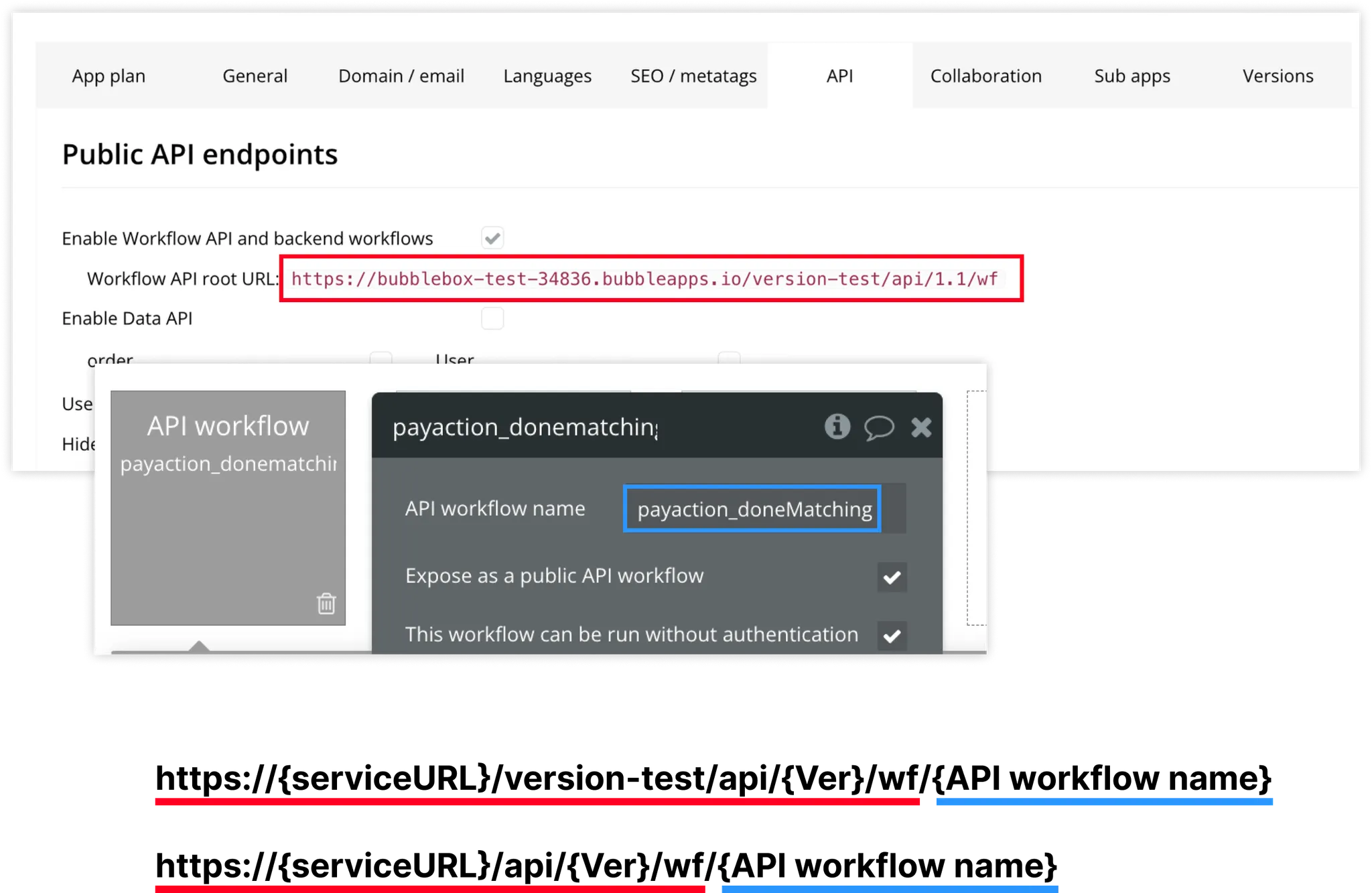 Dev : https://{serviceURL}/version-test/api/{Ver}/wf/{API workflow name}