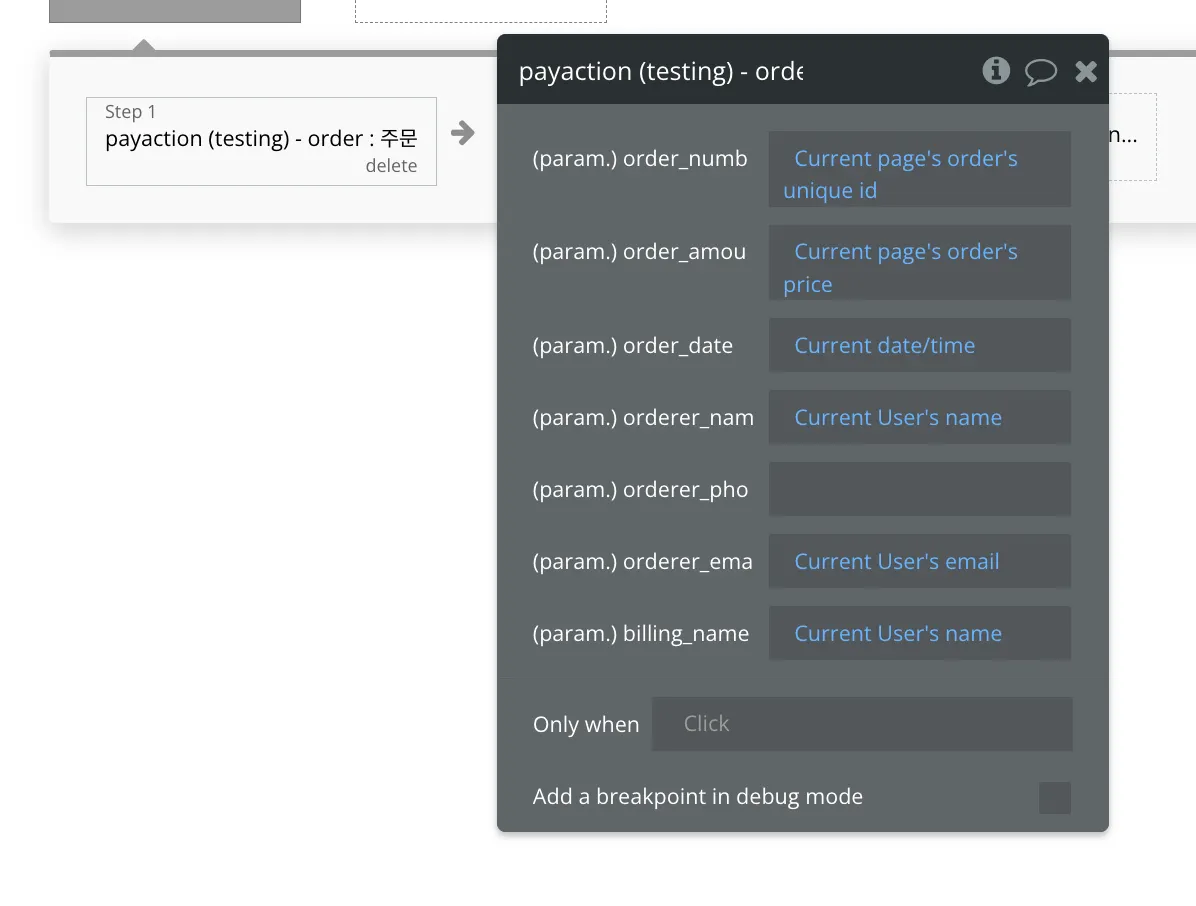 유저의 주문 요청 로직을 처리하는 워크플로우에서 [payaction - order : 주문] 액션 이벤트를 생성하고 값을 입력합니다. [order_number]는 주문의 id 값과 같은 역할을 하므로, 버블에서 order table의 id 필드 값을 그대로 활용하는 게 좋습니다.