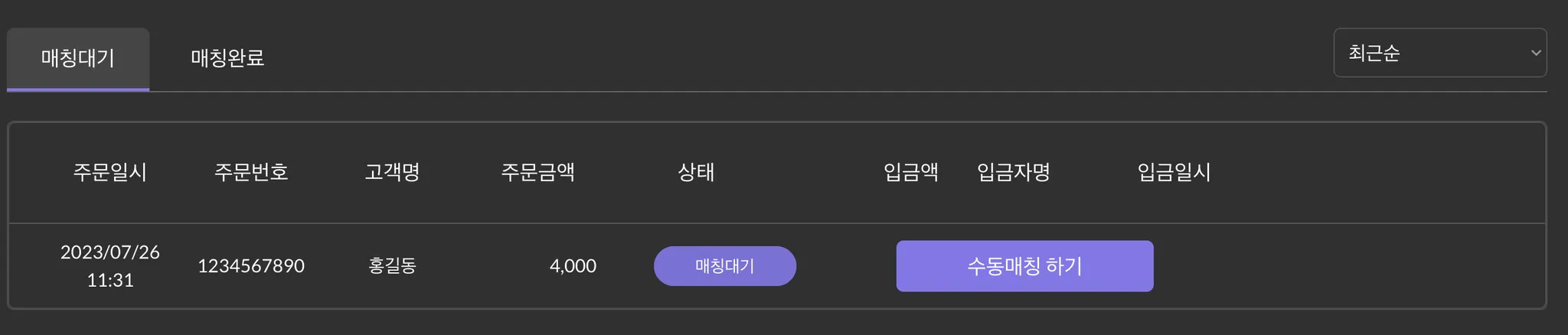 해당 입금자명으로 자동 매칭 시, 매칭 여부를 판단합니다. | |