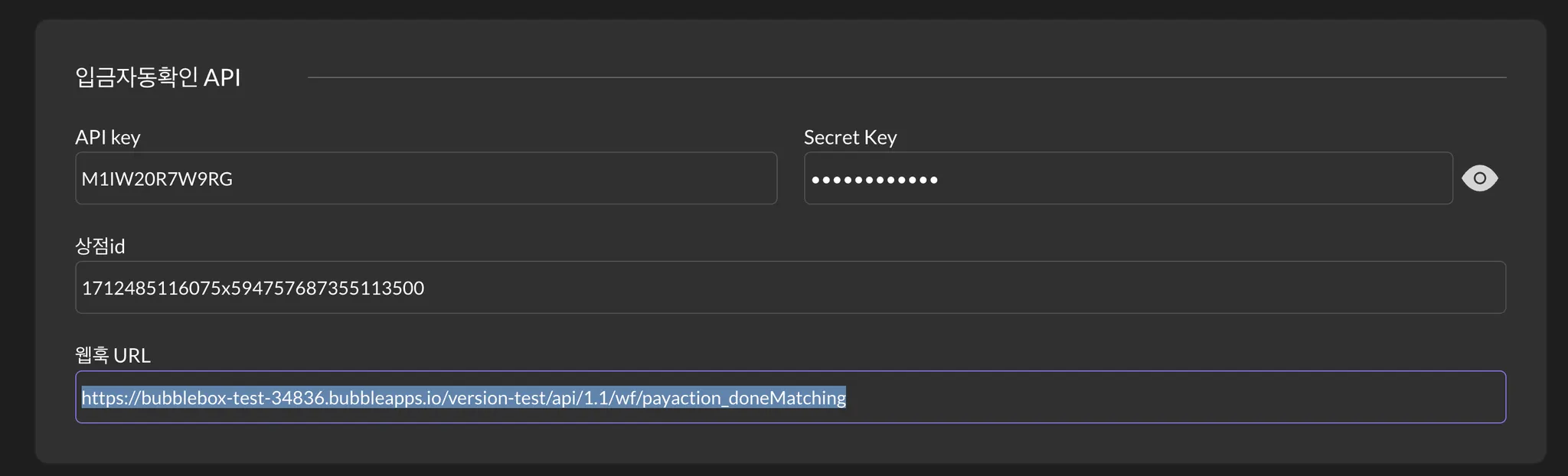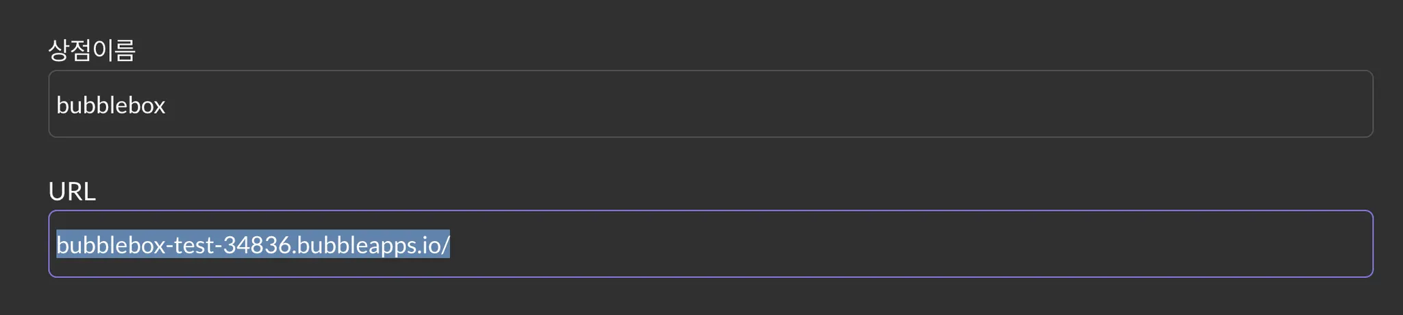 참고로 연동할 상점의 URL은 현재 버블에서 배포한 서비스의 URL을 입력하시면 됩니다. 만약 커스텀 URL을 사용하고 계시다면, 커스텀 URL을 입력해야 합니다.