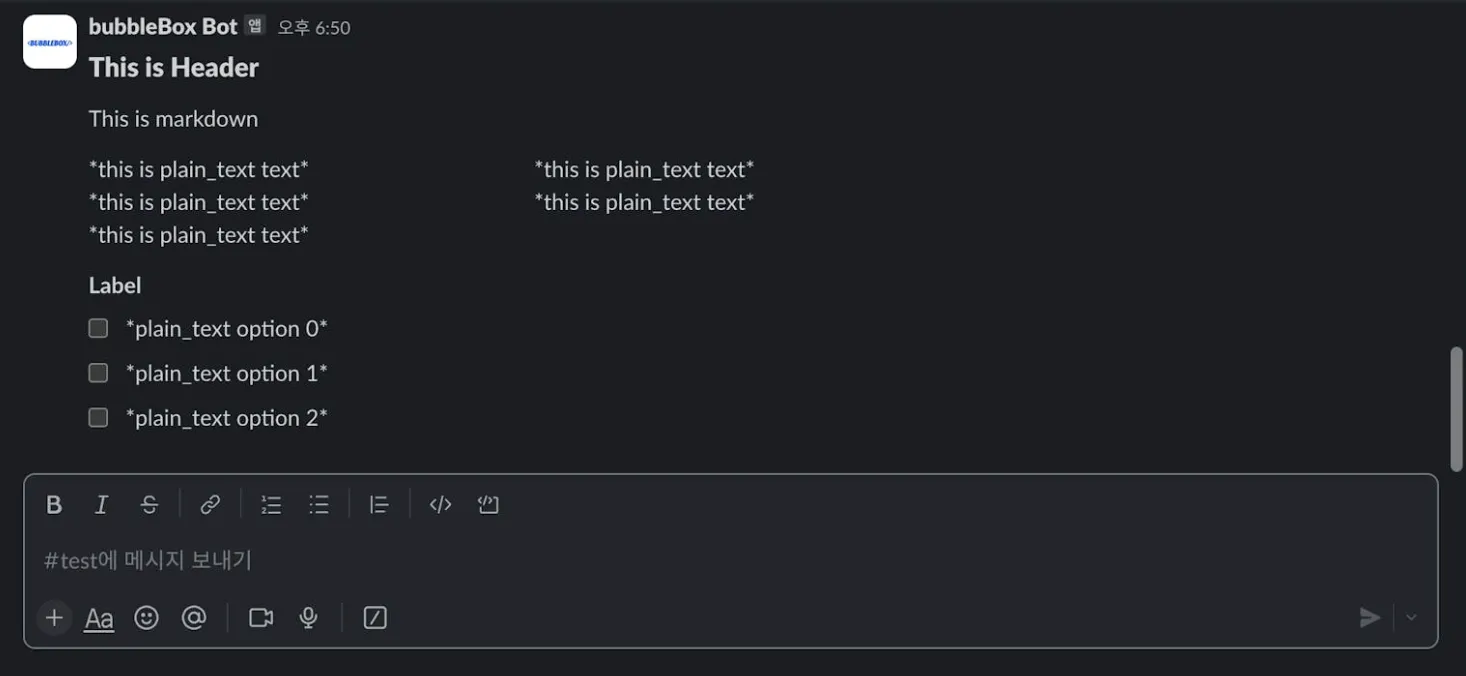 슬랙에 헤드와 바디로 구성된 메시지를 전송합니다.