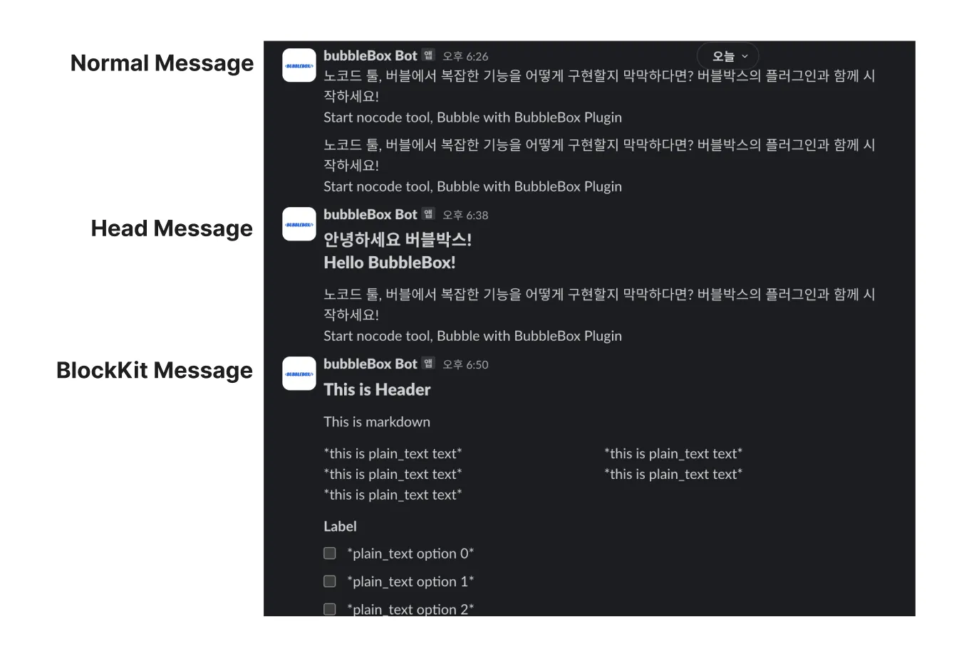 해당 플러그인에서 메시지 즉시 전송 액션은 총 3개 유형을 제공합니다. 필요한 유형을 선택해서 사용하면 됩니다. 각 유형 별 메시지는 슬랙에서 아래처럼 보여집니다.