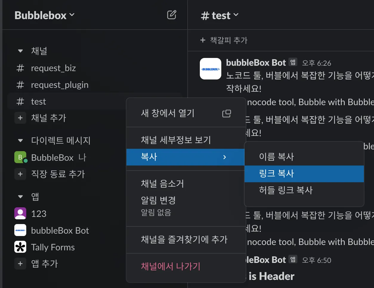 메시지 전송 액션은 모두 channelId 값를 필요로 합니다. 슬랙에 접속한 후, 채널을 우측 마우스로 누릅니다. 그리고 [복사] 탭에서 [링크 복사]를 클릭합니다.