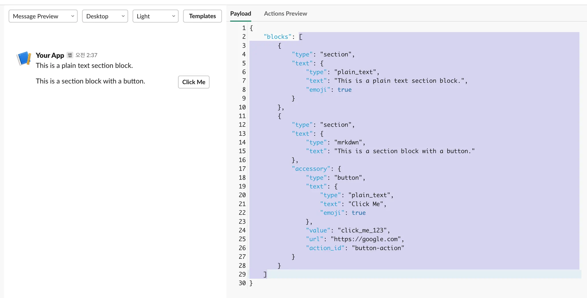 Using Block Kit messages allows for messages to be utilized in various formats. By combining blocks, you can construct Block Kit messages, and you can create the necessary types of blocks and use the relevant JSON data from the Slack Block Kit Builder link below.