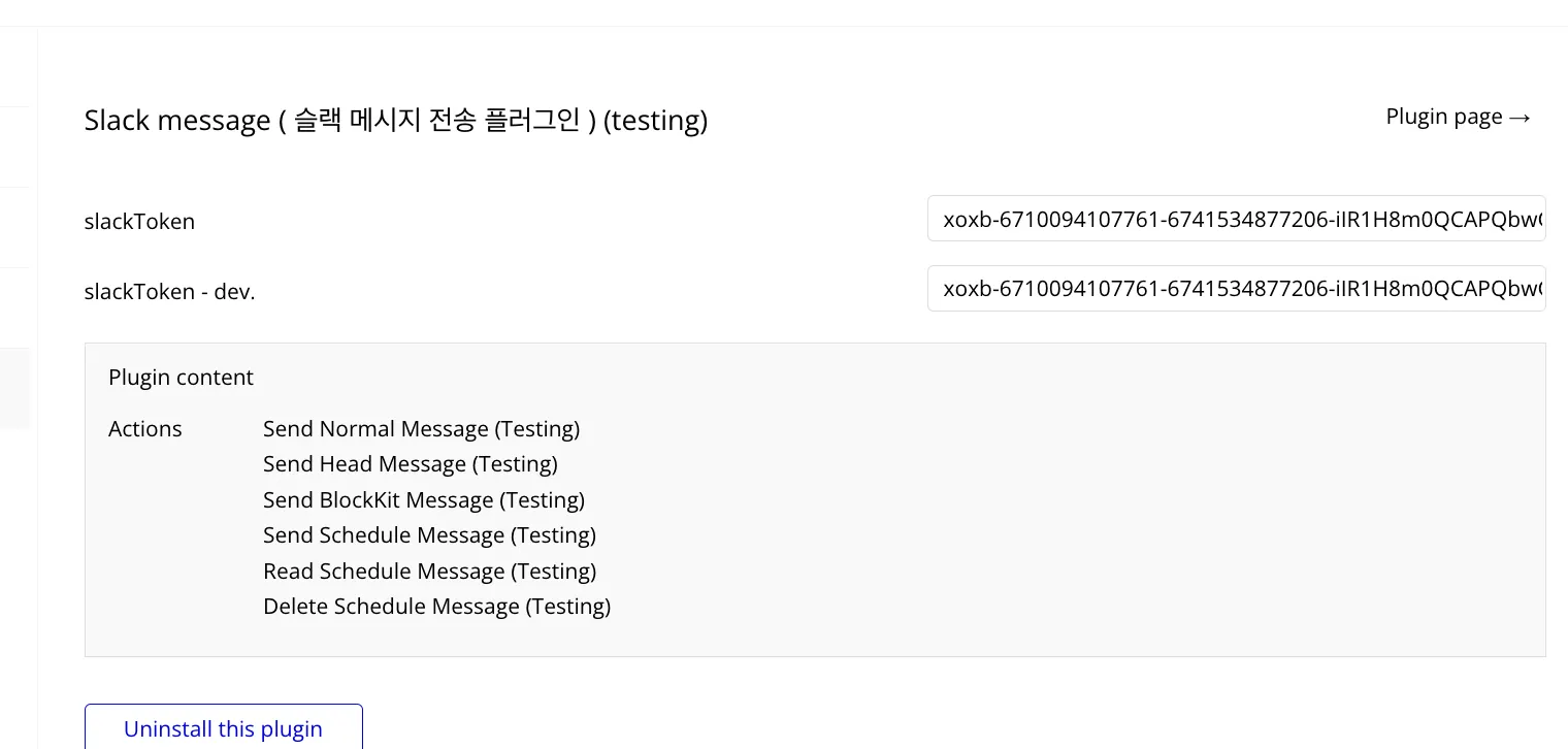 버블 에디터의 [플러그인] 탭으로 이동한 후, 방금 발행한 토큰을 [slackToken]란에 입력합니다.
