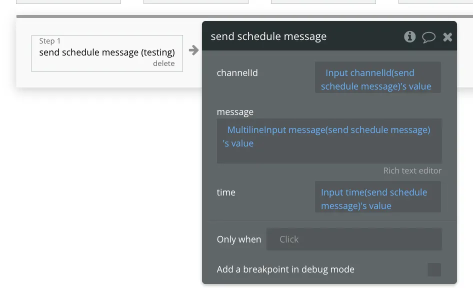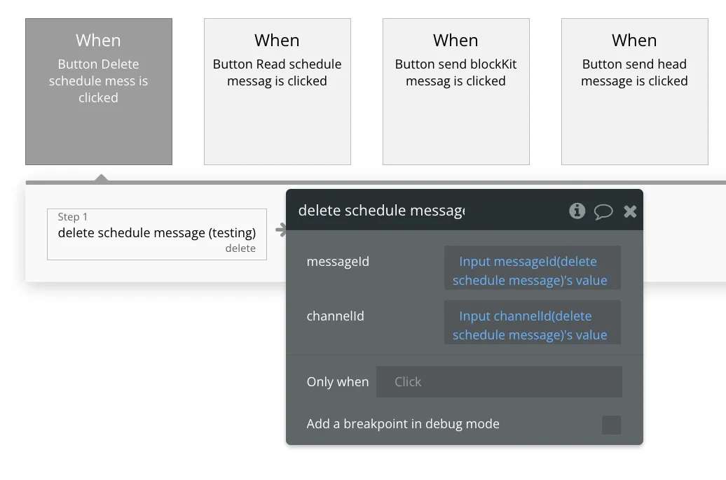 To delete a message, you need to input both the message ID and the channel ID. These values can be verified either (1) through “read schedule message” action or (2) from the return value of “send schedule message” action.