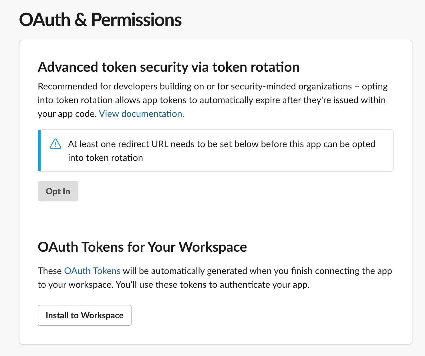 Go to [OAuth Tokens for your workspace] Section by scrolling up. Install app in your workspace and get token
