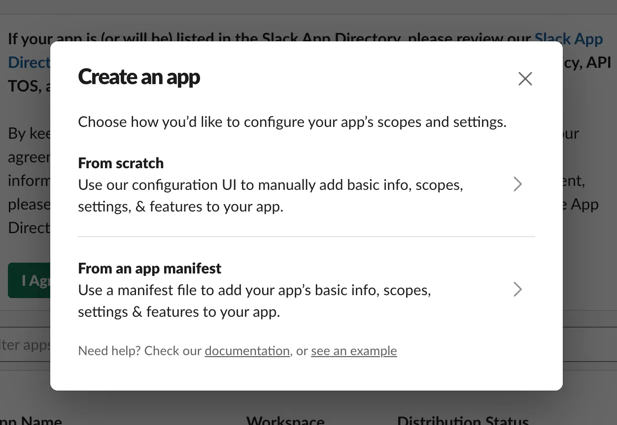 아래 링크에서 슬랙 앱을 생성합니다. Create Slack App at below link