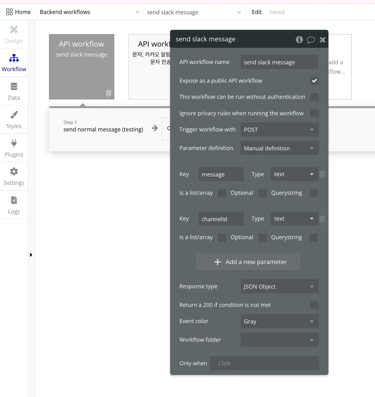 여기서 새로운 백엔드 워크플로우를 생성하고, 액션 이벤트로 슬랙 전송 이벤트를 생성합니다.