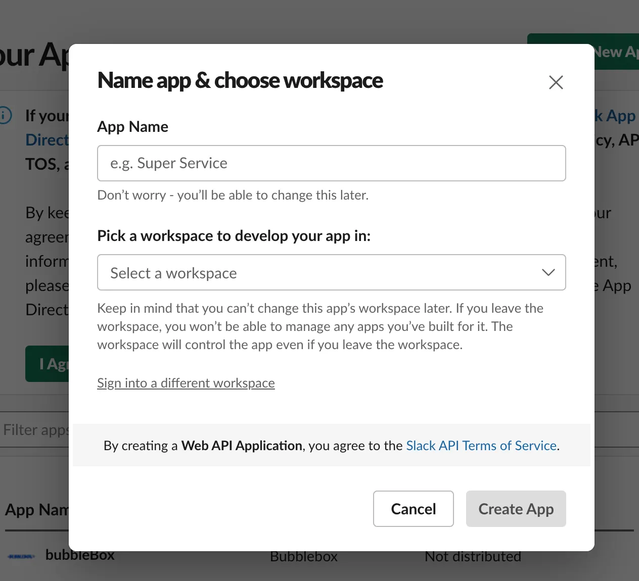 앱 생성 시, [From scratch]를 클릭하면 됩니다. 그리고 앱의 이름과 앱을 설치할 워크스페이스를 선택합니다.