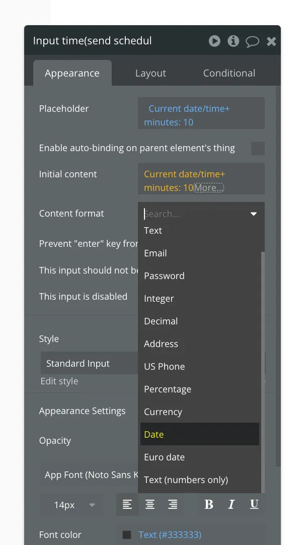 When scheduling a message, you need to input the send time, which must be in the future. The time should be entered as a date type in the format of the bubble.