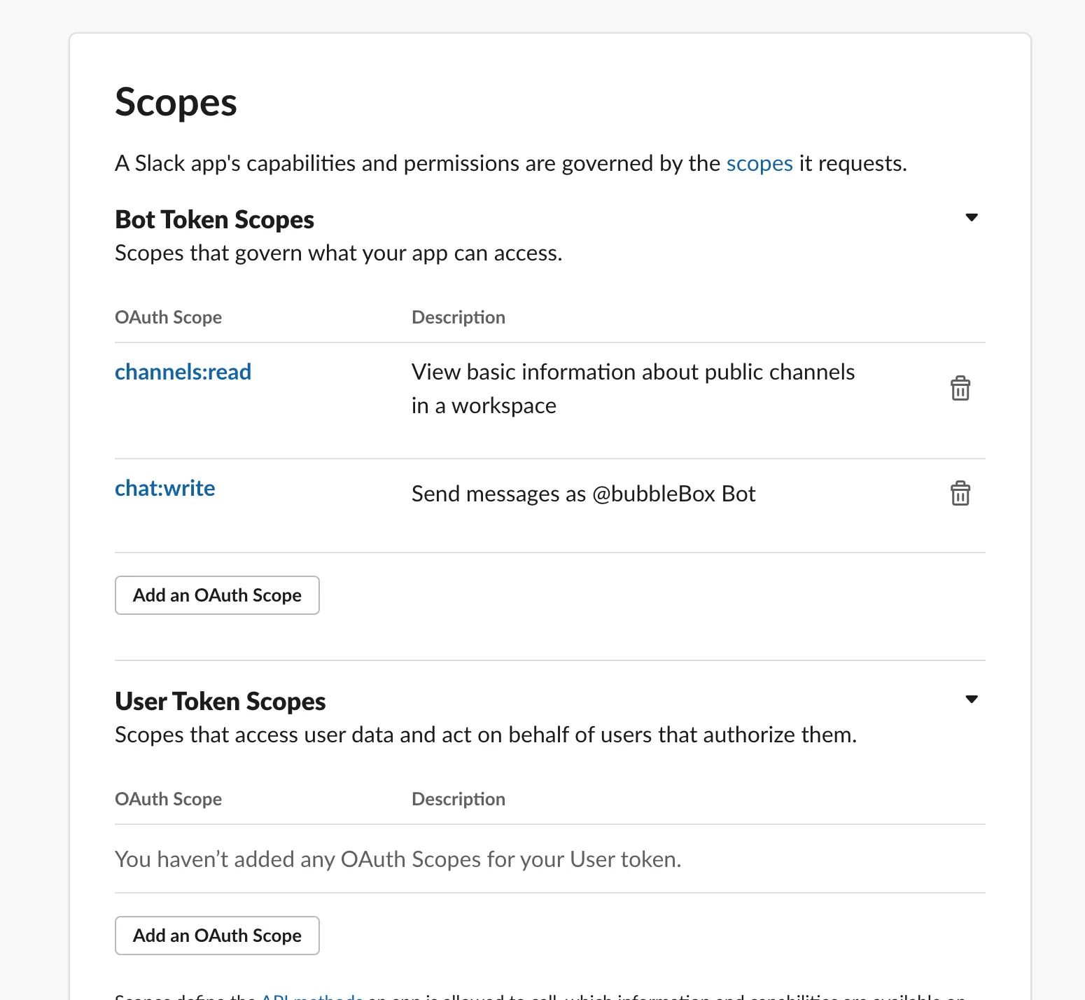chat:write → 봇이 메시지를 작성할 수 있습니다.