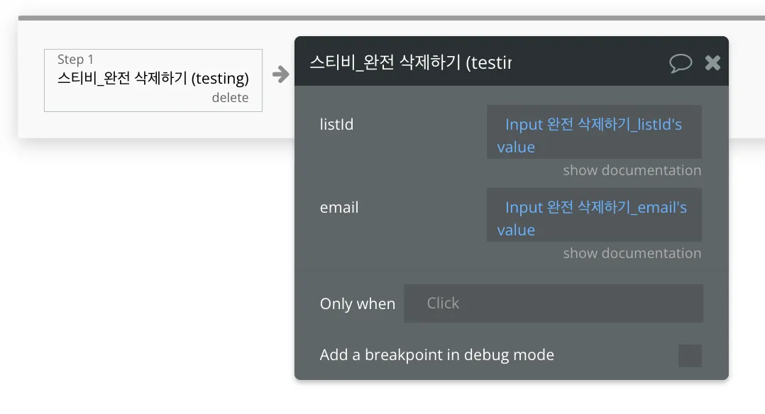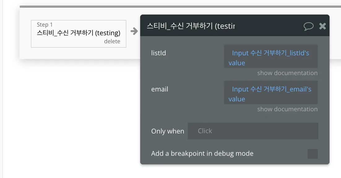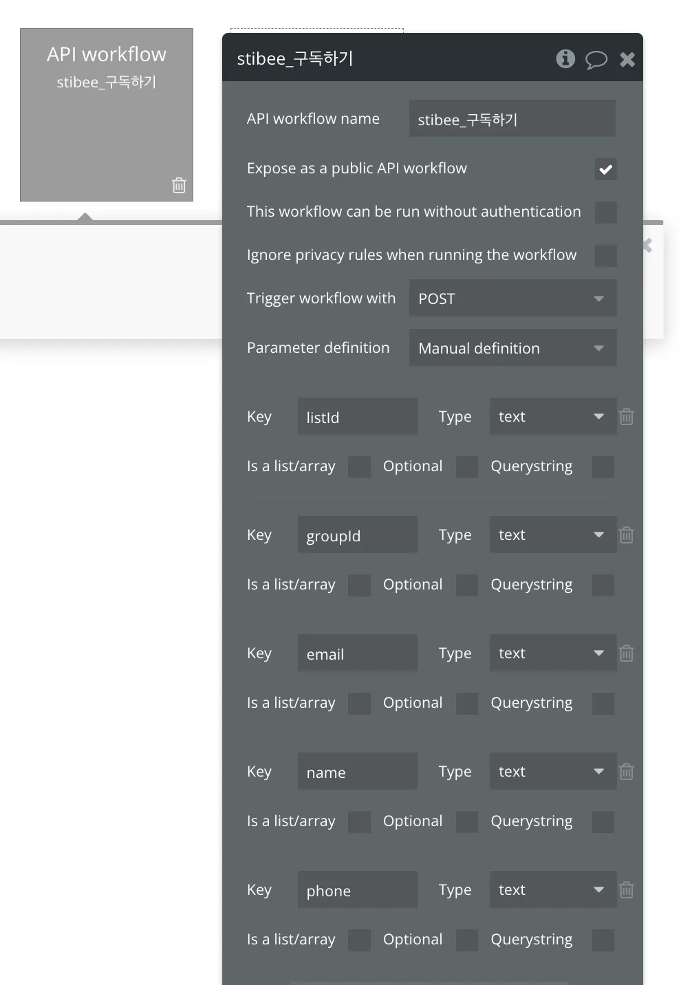 워크플로우에서 [스티비_구독하기] 액션을 생성하고, [listId] 값에 앞서 확인한 주소록 id를 입력합니다. 그러면, 해당 주소록으로 유저를 구독시킬 수 있습니다.