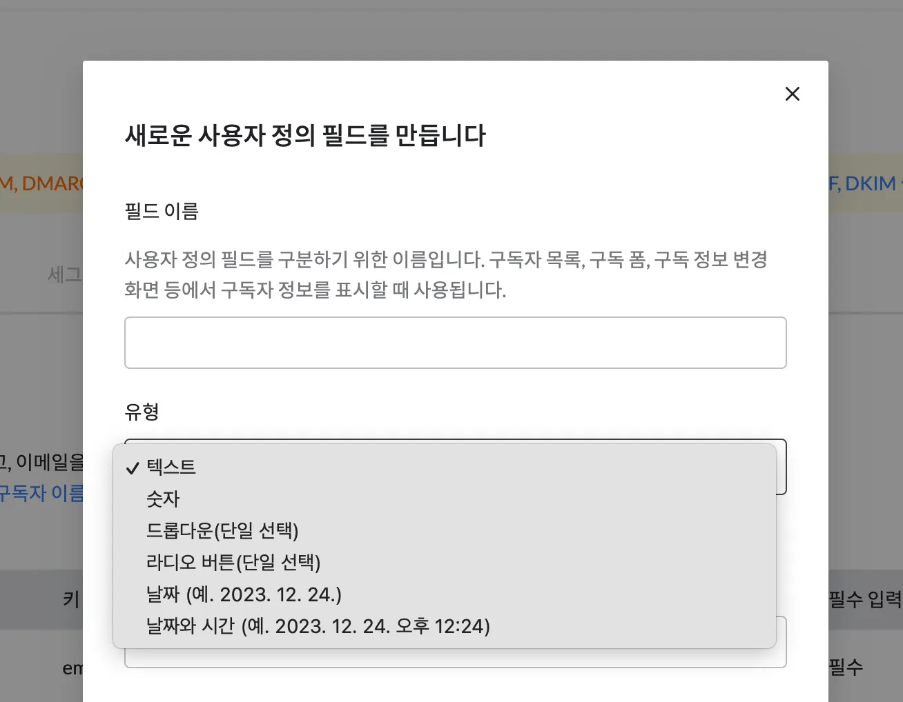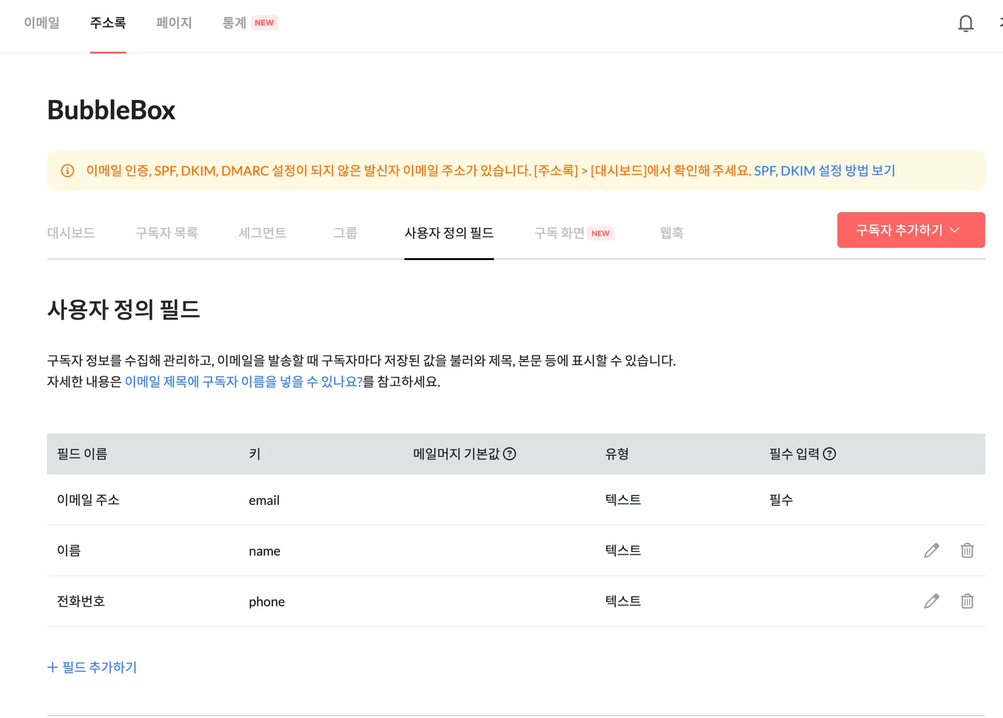 구독자를 추가할 때, 구독자에 대한 정보를 추가 필드로 스티비에서 받을 수 있습니다. 주소록 대시보드에서 [사용자 정의 필드]로 이동하면, 해당 주소록이 보유한 데이터 필드를 확인할 수 있습니다. 만약 유저의 전화번호도 추가적으로 수집하고 싶다면, [필드 추가하기] 버튼을 클릭하고 전화번호 필드를 추가합니다.