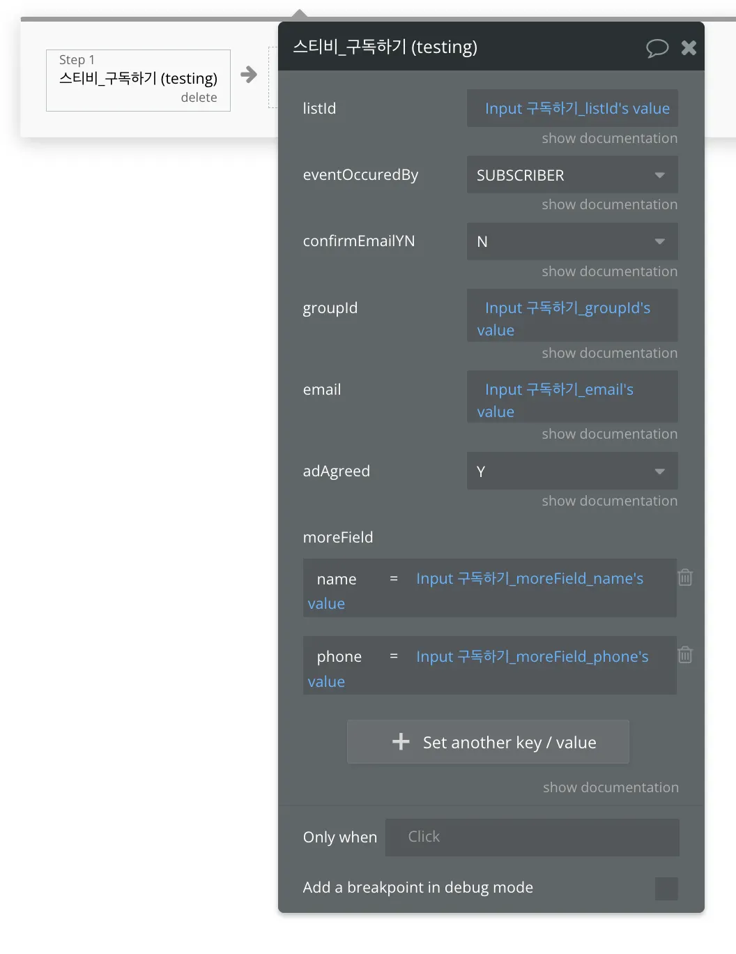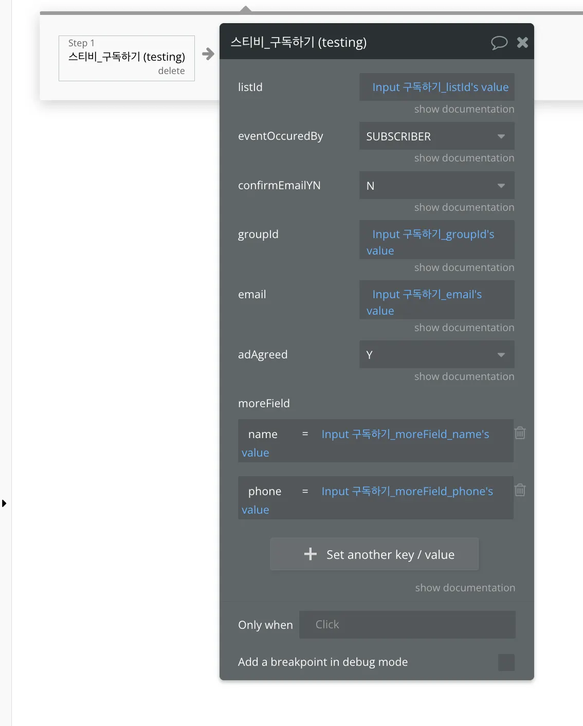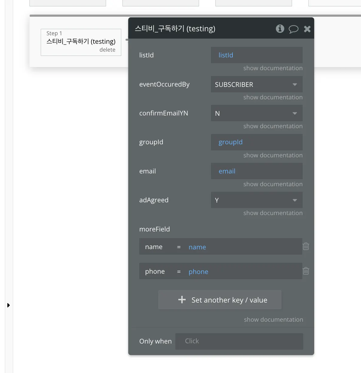이후 [스티비_구독하기] 액션에서 [moreField]에 앞서 생성한 사용자 정의 필드에 값을 전달할 수 있습니다. 예를 들어, “phone”이라는 사용자 정의 필드를 스티비에서 만들었다면, 액션 설정 창에서 Key는 “phone”을 입력하고, Value에는 해당 필드의 값을 입력합니다.