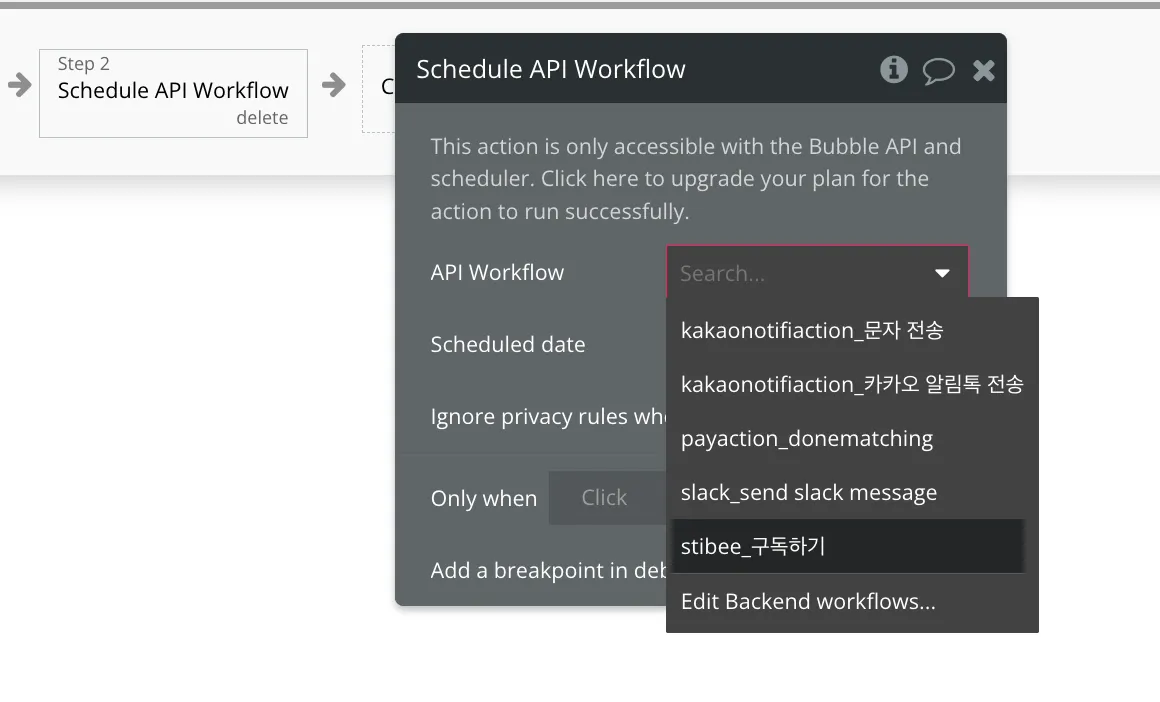 다시 페이지로 이동하고, 워크플로우의 트리거로 [schedule API Workflow]를 생성합니다. 그리고 앞서 생성한 백엔드 API를 선택합니다.