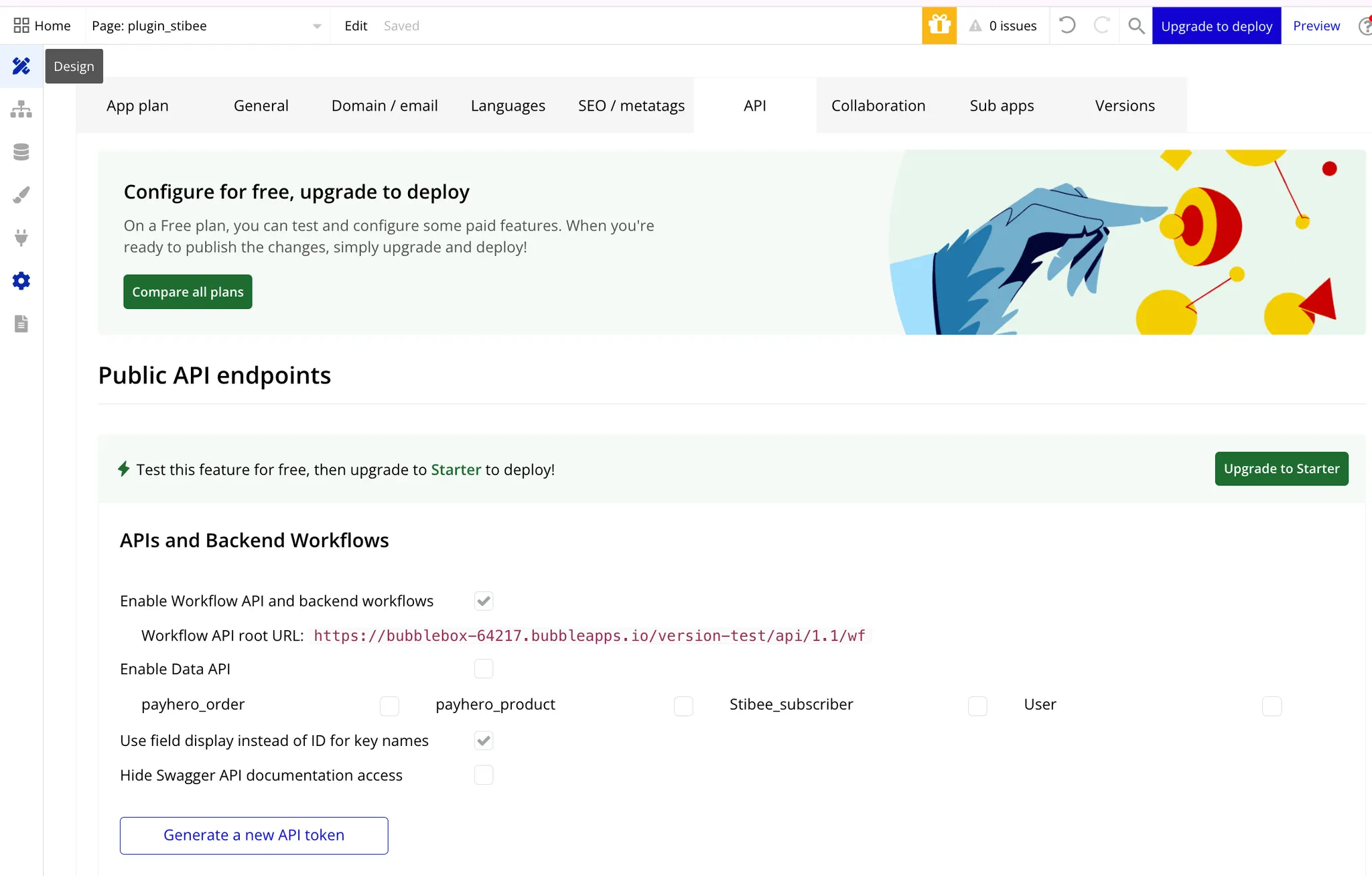 이를 방지하기 위해 백엔드 API를 활용해야 합니다. 백엔드 API는 페이지가 아닌 서버에서 작동이 되며, 유저가 페이지를 이탈해도 워크플로우가 돌아갑니다. 버블 에디터에서 [설정] 탭으로 이동하고, [API] 탭으로 들어갑니다. 여기서 [Enable workflow API and backend workflows]를 활성화 합니다.
