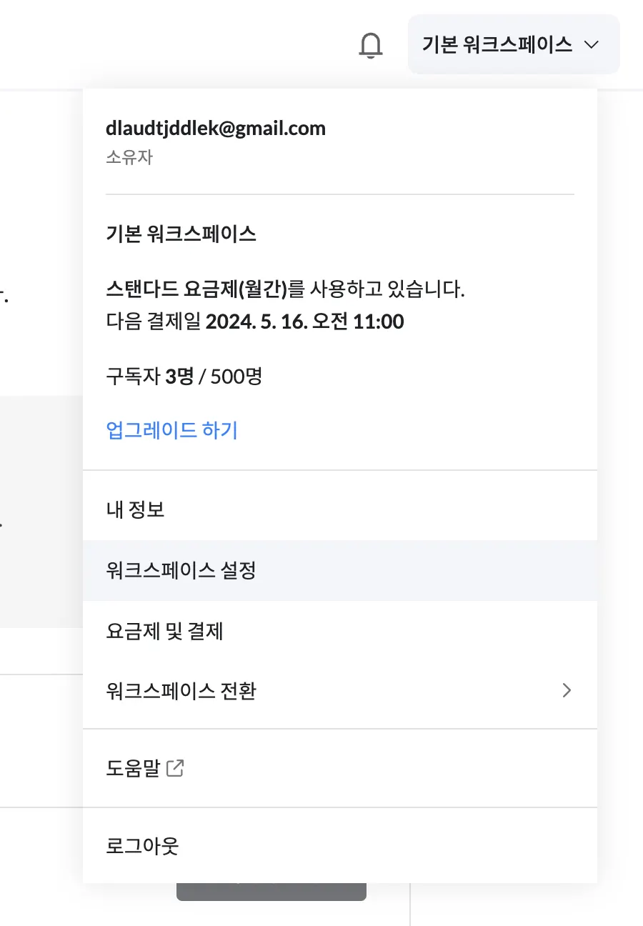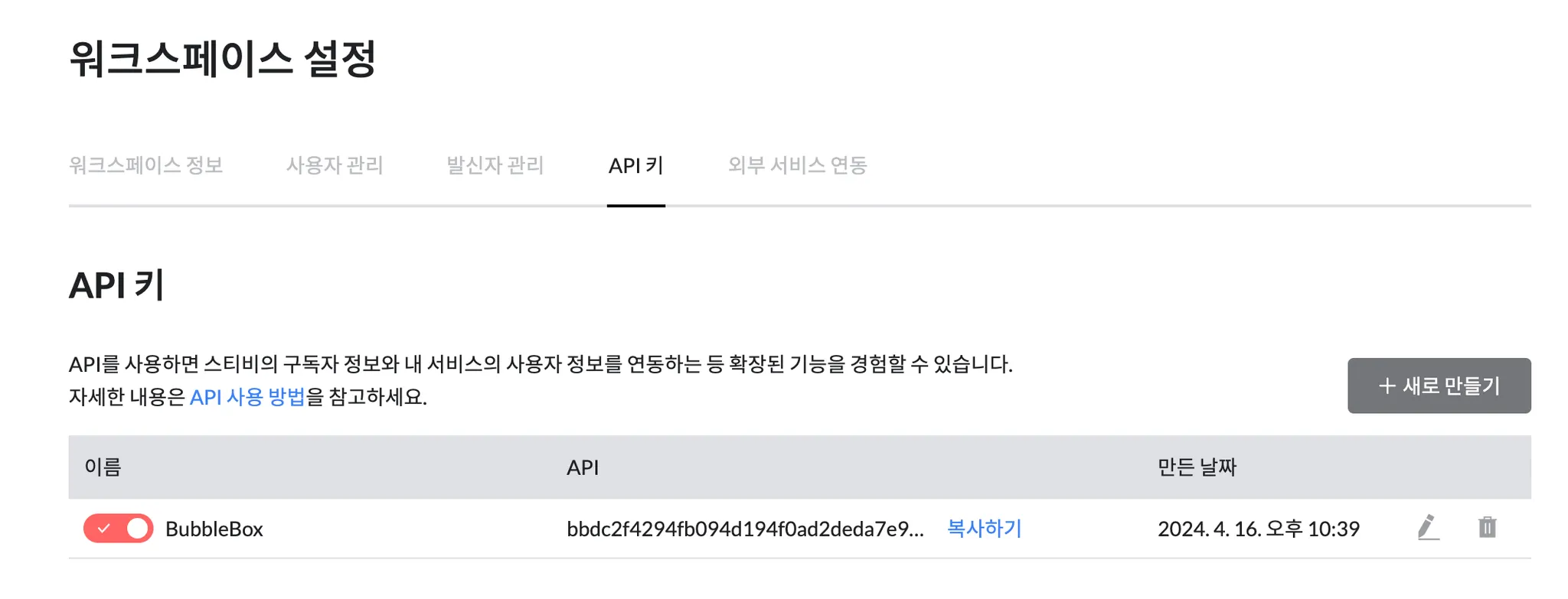 워크스페이스 설정 페이지에서 [API 키] 탭으로 이동합니다. 여기서 API 키를 발급하고, [복사하기]를 눌러 복사합니다.