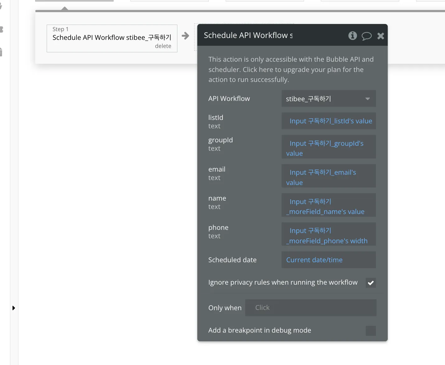 그러면 앞서 백엔드 API에서 설정한 파라미터를 입력할 수 있습니다. 관련 데이터를 입력하면 되며, [Scheduled date]는 current date/time으로 설정합니다. 참고로 [Ignore privacy rules when running the workflow]를 고려해야 합니다. privacy rule을 고려하지 않으면, 보안 정책으로 데이터가 전달되지 않을 수 있습니다. 해당 설정은 [데이터] 탭의 [Privacy] 탭에서 관리할 수 있습니다.