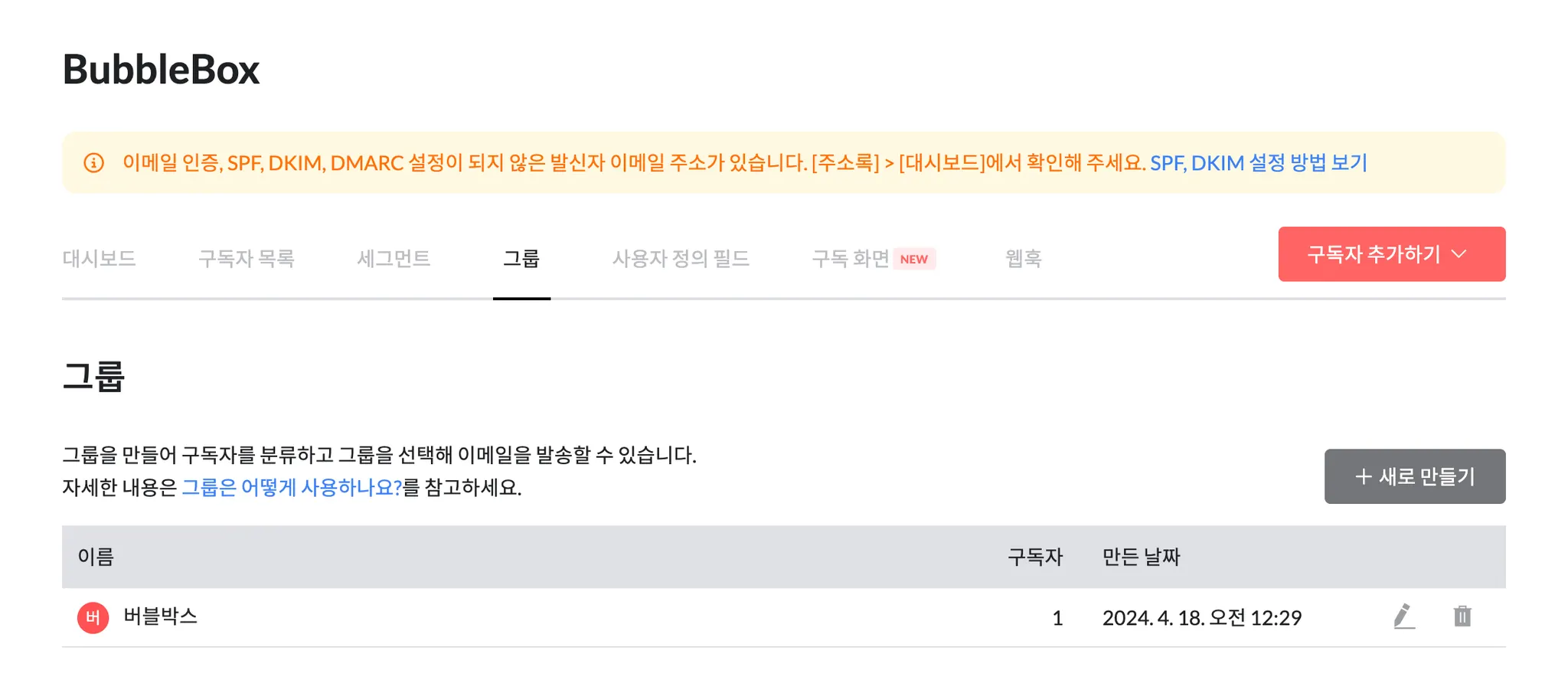 구독자를 생성할 때, 해당 구독자를 특정 그룹에 속하게 만들 수 있습니다. 그룹은 특정 주소록에 속하며, 1개의 주수록은 다수의 그룹을 보유할 수 있습니다. 또한, 1명의 유저는 다수의 그룹에 속할 수 있습니다.