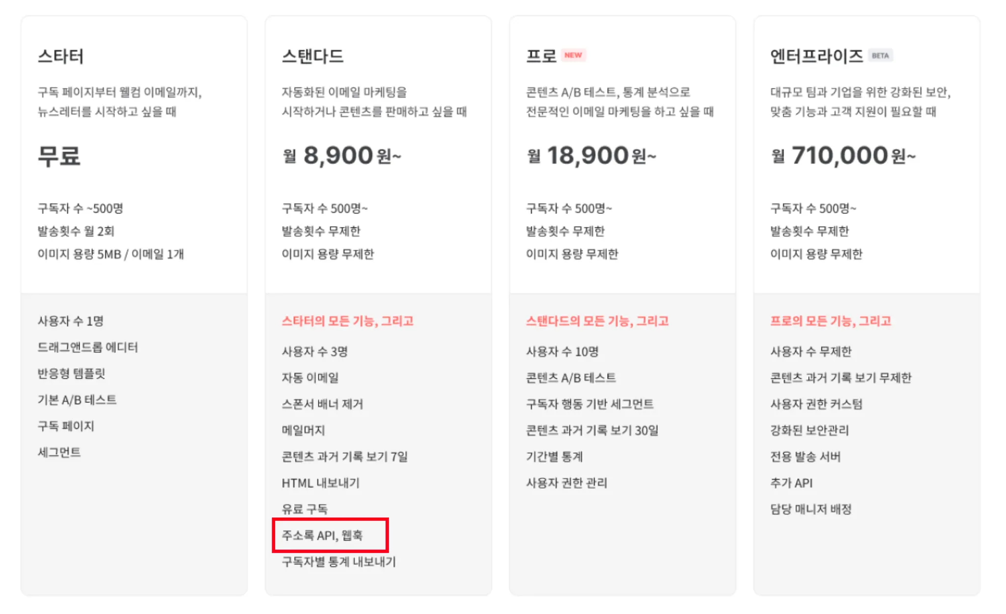 스티비 플러그인을 사용하기 위해서 스티비 API가 필요합니다. 스티비 API는 스티비 유료 플랜을 사용해야 합니다. 아래 요금제 정책은 24.04.19 기준입니다.