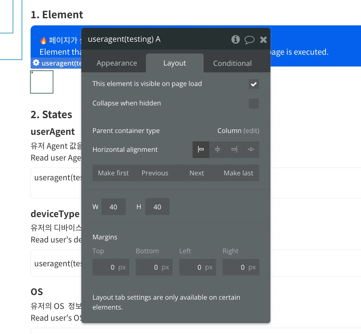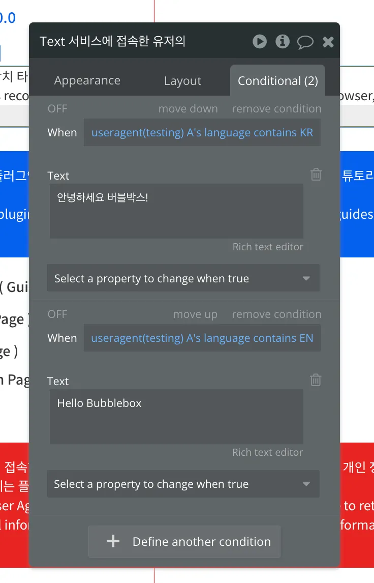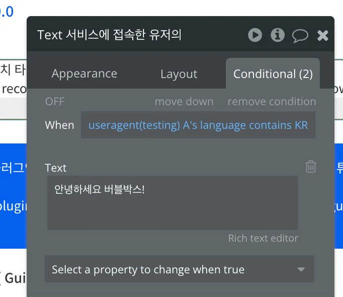[user analytics] 요소에서 [language] state 값을 활용해 유저가 어떤 언어를 사용하는지 알 수 있습니다. 이를 활용해 언어 별로 맞춤형 정보를 보여줄 수 있습니다. 예를 들어, text 요소의 [conditional] 탭에서 조건을 추가하고, “user analytics’s language contains KR”를 조건문으로 입력합니다. 그리고, 출력되는 글자로 한국어(”안녕하세요”)를 입력합니다.