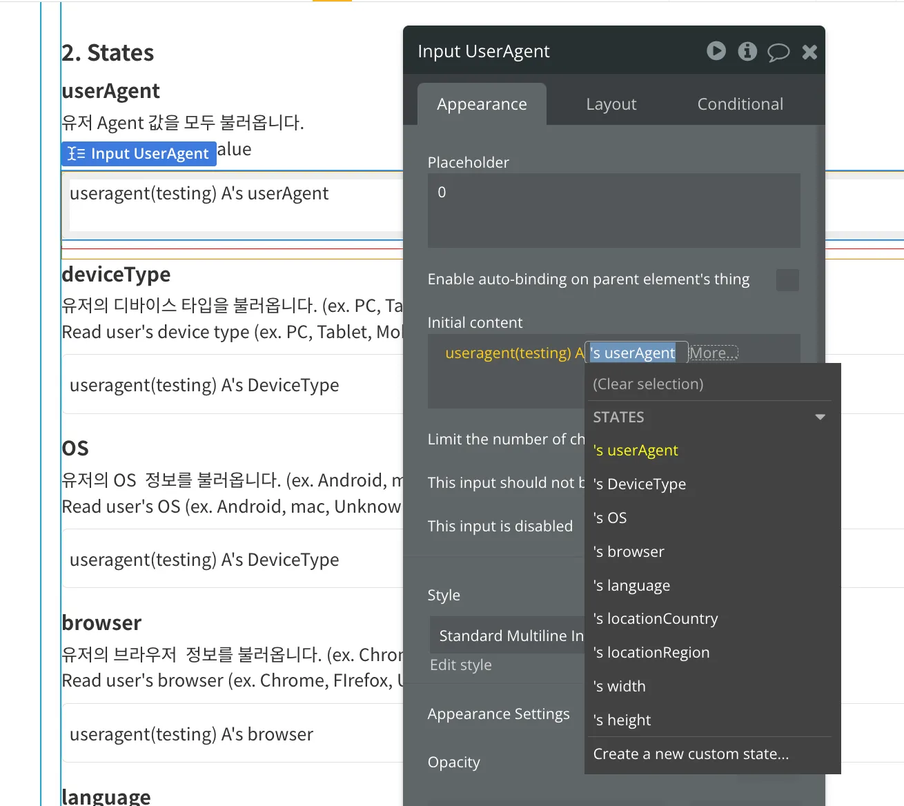 The [language] state value in the [user analytics] element can be utilized to determine the language preference of the user. This can be leveraged to display customized information tailored to each language. For example, in the [conditional] tab of a text element, you can add a condition by entering "user analytics's language contains KR" as the condition. Then, input "안녕하세요" (which means "hello" in Korean) as the text to be displayed when this condition is met.