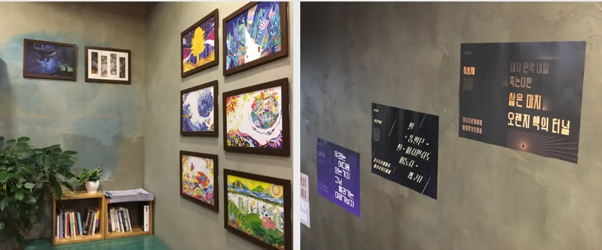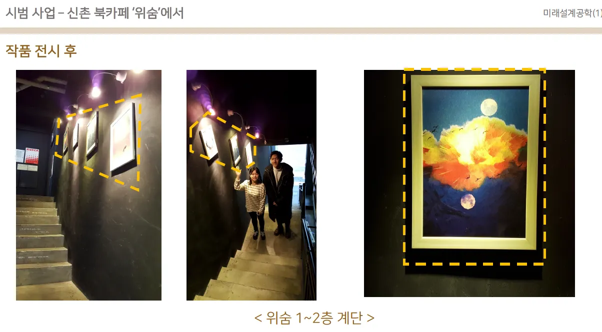 (1차) 신촌 북카페, 위숨의 사장님과 컨택해 카페 계단, 내부 등의 잉여 공간에서 전시회를 진행했습니다.