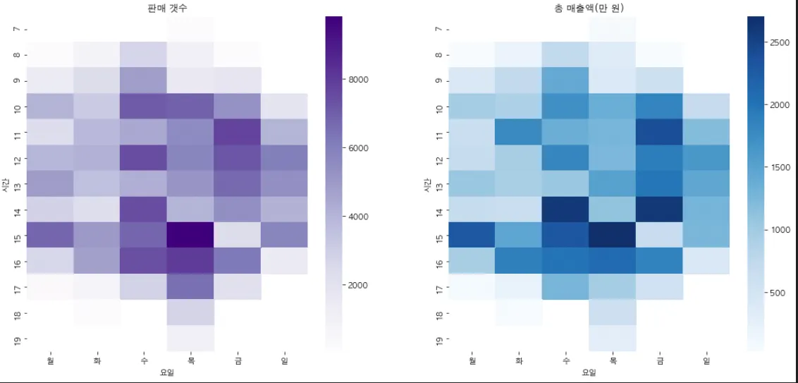 이번 주, 각 요일의 시간별 매출 및 판매건수 히트맵