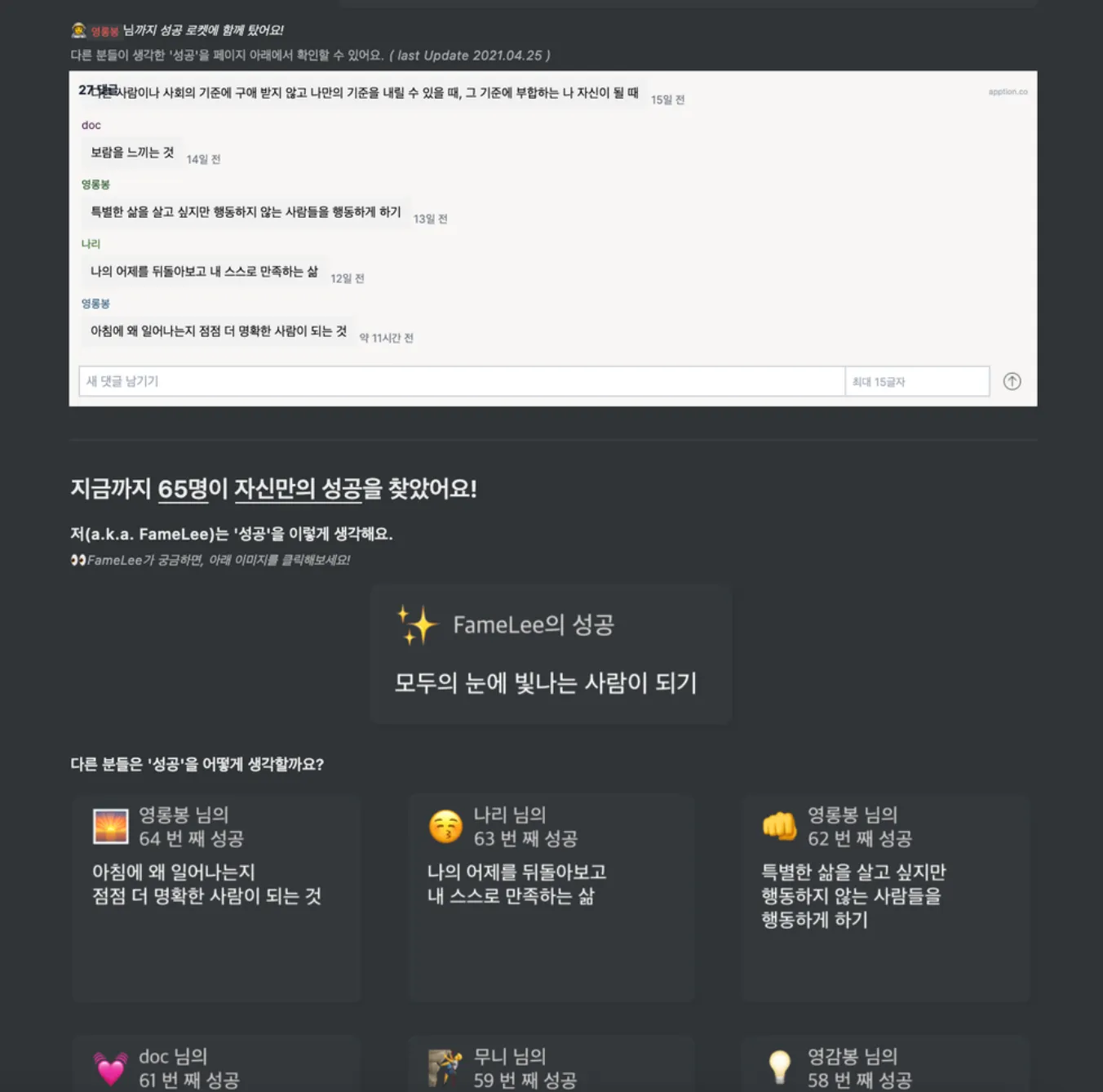 댓글 기능을 구현해, 각자가 생각하는 성공이 무엇인지 익명으로 적을 수 있게 만들었습니다.